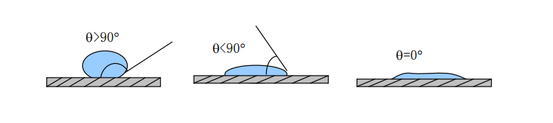 接觸角的含義如下圖所示,值越大,表明材料越疏水,當(dāng)?shù)扔诹銜r,表明液體(水)能浸潤固體表面,以下是一些數(shù)據(jù)。